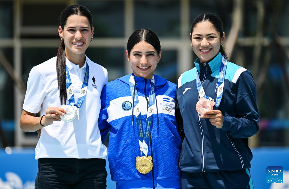 Gold medalist Ivonne Sarai Nochez Gallardo (C) of El Salvador, silver medalist Haila Brunet Alvarez (L) of France and bronze medalist Dalia Soberanis of Guatemala pose during the victory ceremony for the Women's Sprint 100m of Inline Speed Skating Road event at The World Games 2025 in Chengdu, southwest China's Sichuan Province, Aug. 13, 2025. (Xinhua/Xie Jianfei)