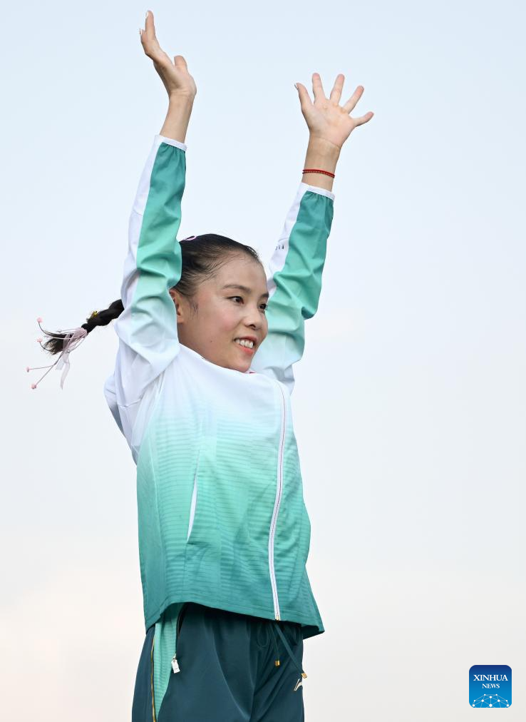 Gold medalist Shang Chunsong of China reacts during the awarding ceremony for the Women's Freestyle of Parkour event at The World Games 2025 in Chengdu, southwest China's Sichuan Province, Aug. 13, 2025. (Xinhua/Li Jianan)