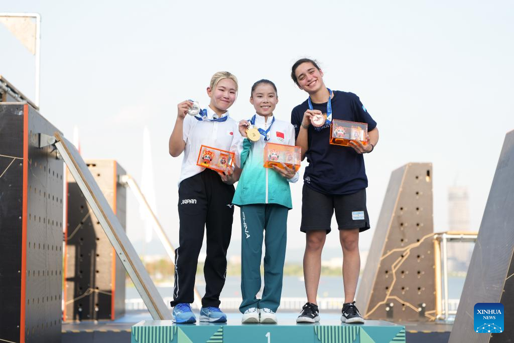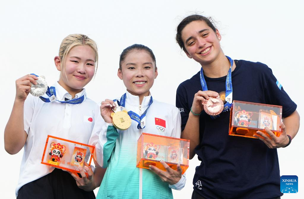 Gold medalist Shang Chunsong (C) of China, silver medalist Nagai Nene (L) of Japan and bronze medalist Sara Banchoff Tzancoff of Argentina pose during the awarding ceremony for the Women's Freestyle of Parkour event at The World Games 2025 in Chengdu, southwest China's Sichuan Province, Aug. 13, 2025. (Xinhua/Li Jianan)