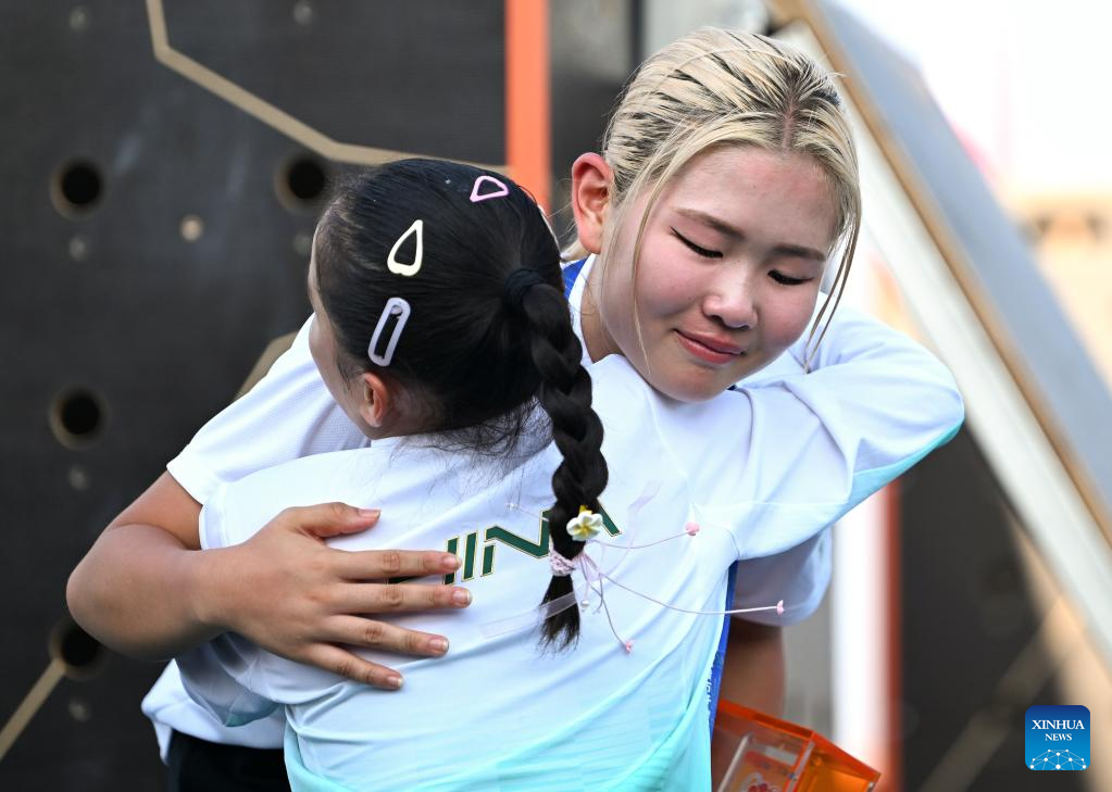 Gold medalist Shang Chunsong (L) of China hugs silver medalist Nagai Nene of Japan during the awarding ceremony for the Women's Freestyle of Parkour event at The World Games 2025 in Chengdu, southwest China's Sichuan Province, Aug. 13, 2025. (Xinhua/Li Jianan)