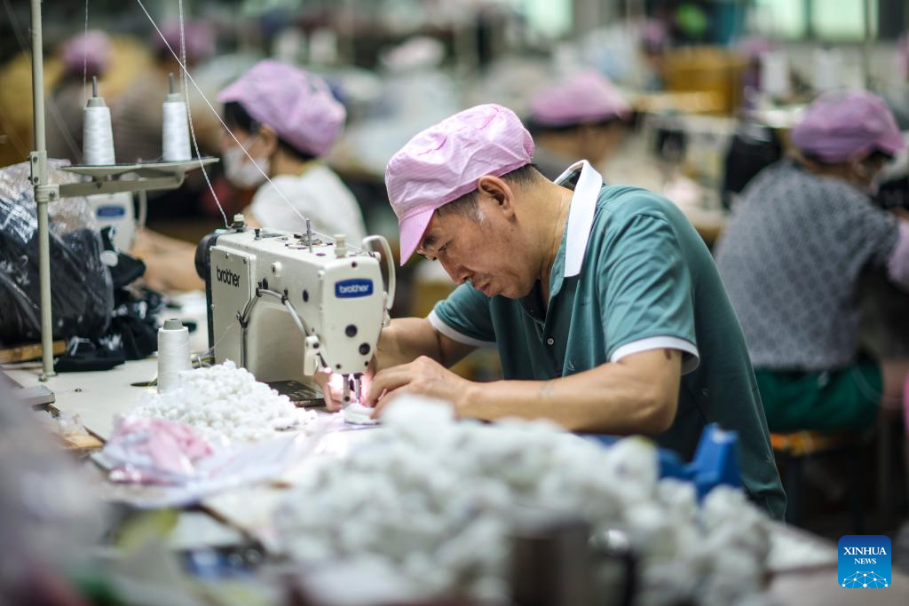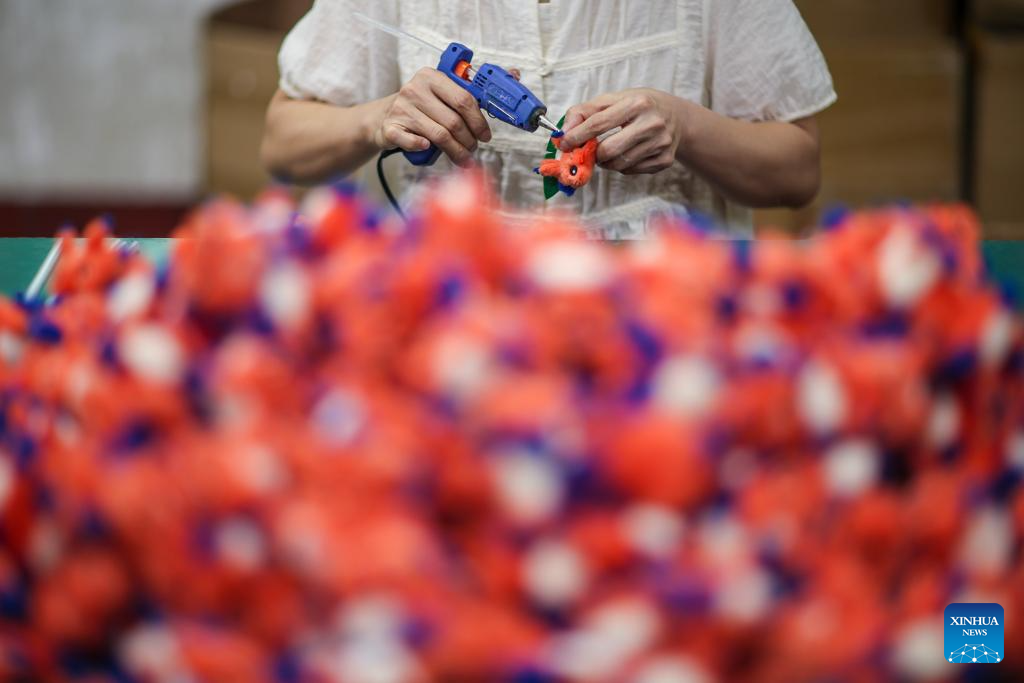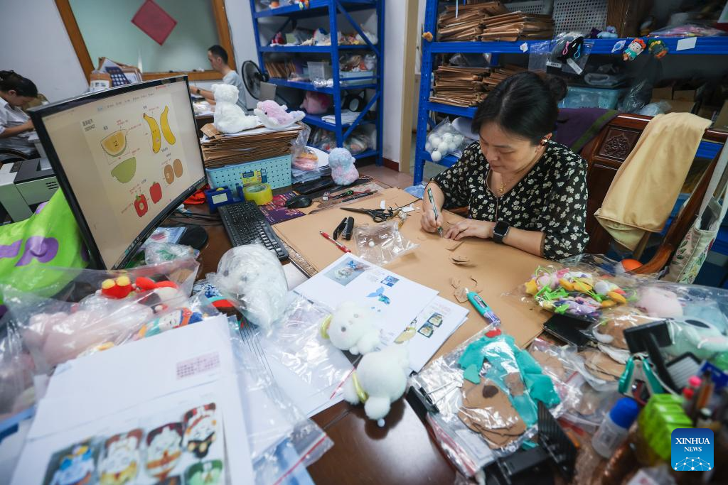 Workers process fabrics at a toy factory in Dongguan, south China's Guangdong Province, Aug. 11, 2025. Bag charms have gained increasingly popularity in China recently, which allow young people to express themselves while fueling an emgering business.