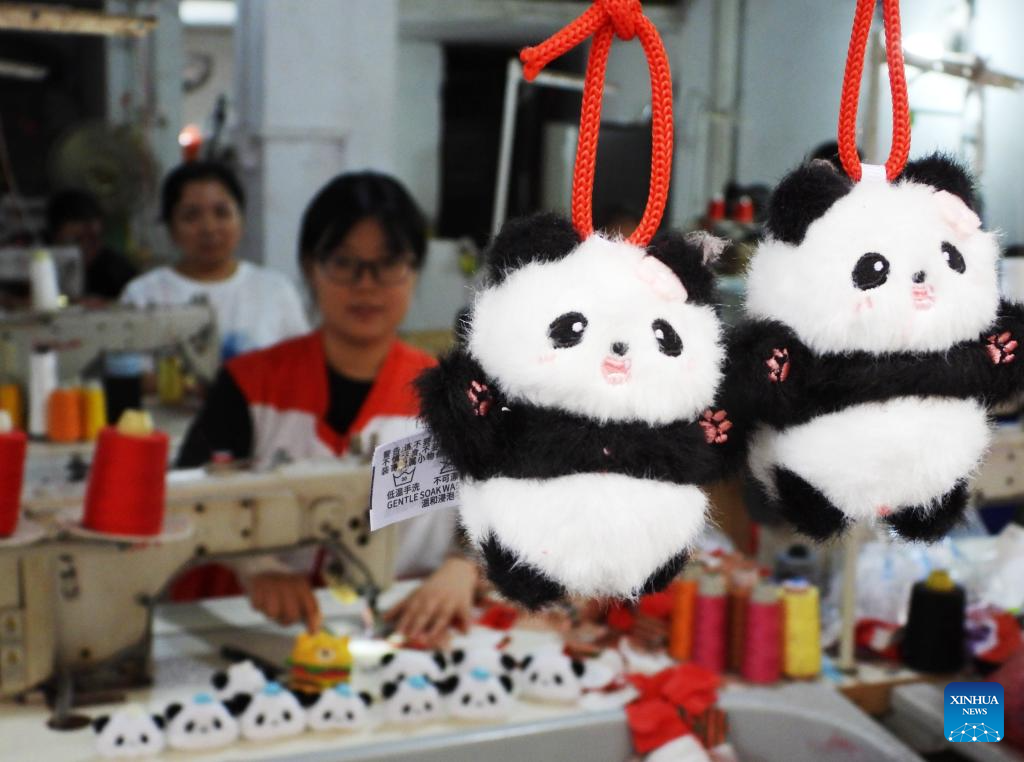 Panda-shaped bag charms to be exported are pictured at a toy manufacturing factory in Dazhou City, southwest China's Sichuan Province, Aug. 11, 2025. Bag charms have gained increasingly popularity in China recently, which allow young people to express themselves while fueling an emgering business.