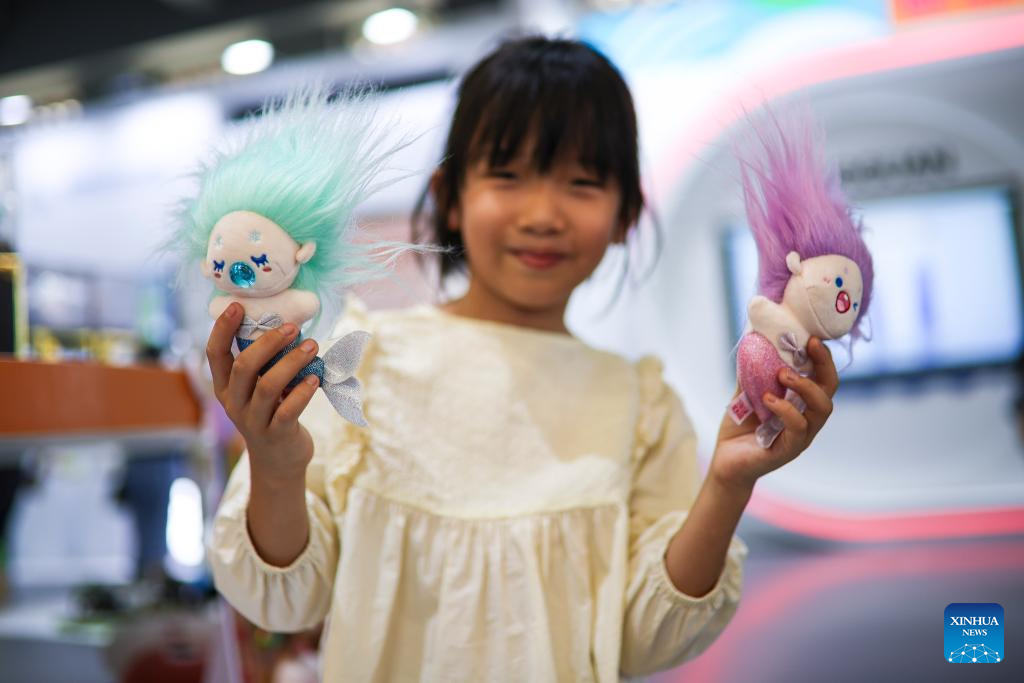 A young girl presents bag charms during an anime and comic exhibition in Dongguan, south China's Guangdong Province, Aug. 11, 2025. Bag charms have gained increasingly popularity in China recently, which allow young people to express themselves while fueling an emgering business.