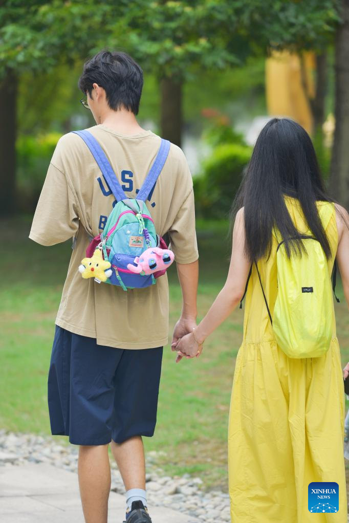 A young man carrying a bag attached with bag charms is pictured in Chengdu City, southwest China's Sichuan Province, Aug. 9, 2025. Bag charms have gained increasingly popularity in China recently, which allow young people to express themselves while fueling an emgering business.