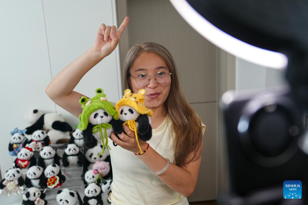 A staff member promotes panda-shaped bag charms via livestreaming at a company in Chengdu City, southwest China's Sichuan Province, Aug. 10, 2025. Bag charms have gained increasingly popularity in China recently, which allow young people to express themselves while fueling an emgering business.