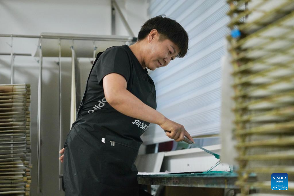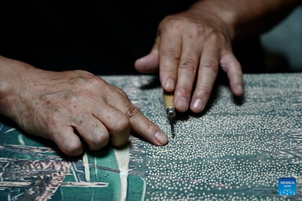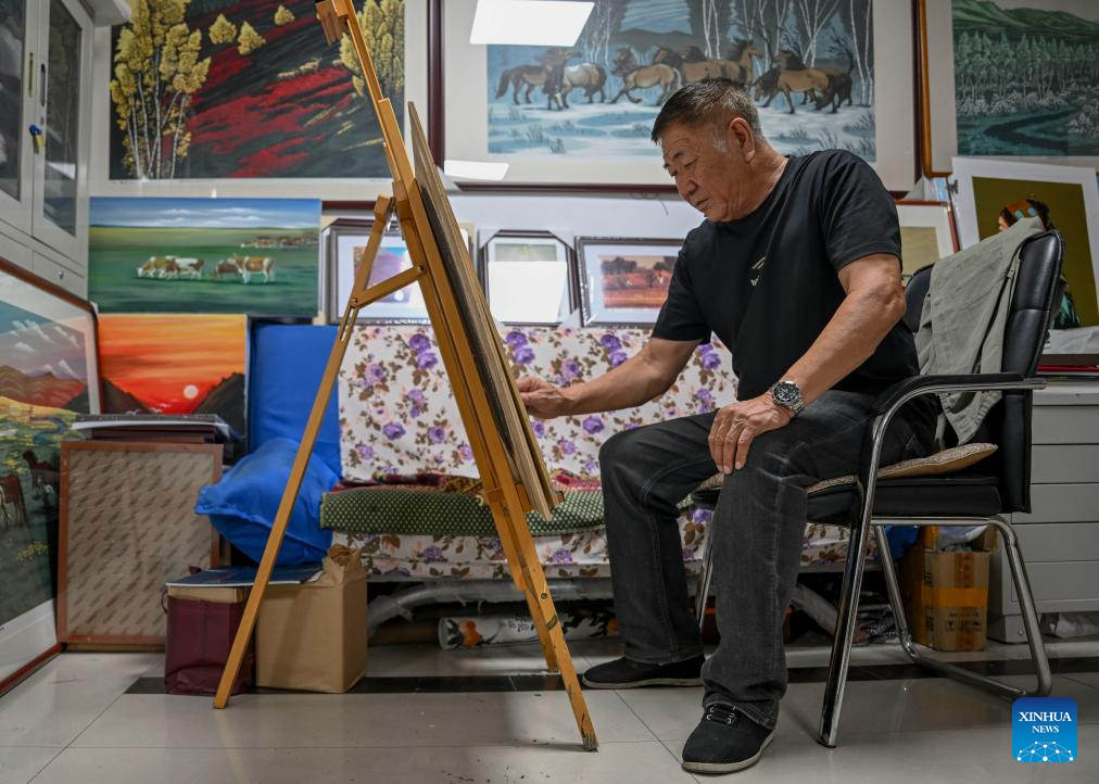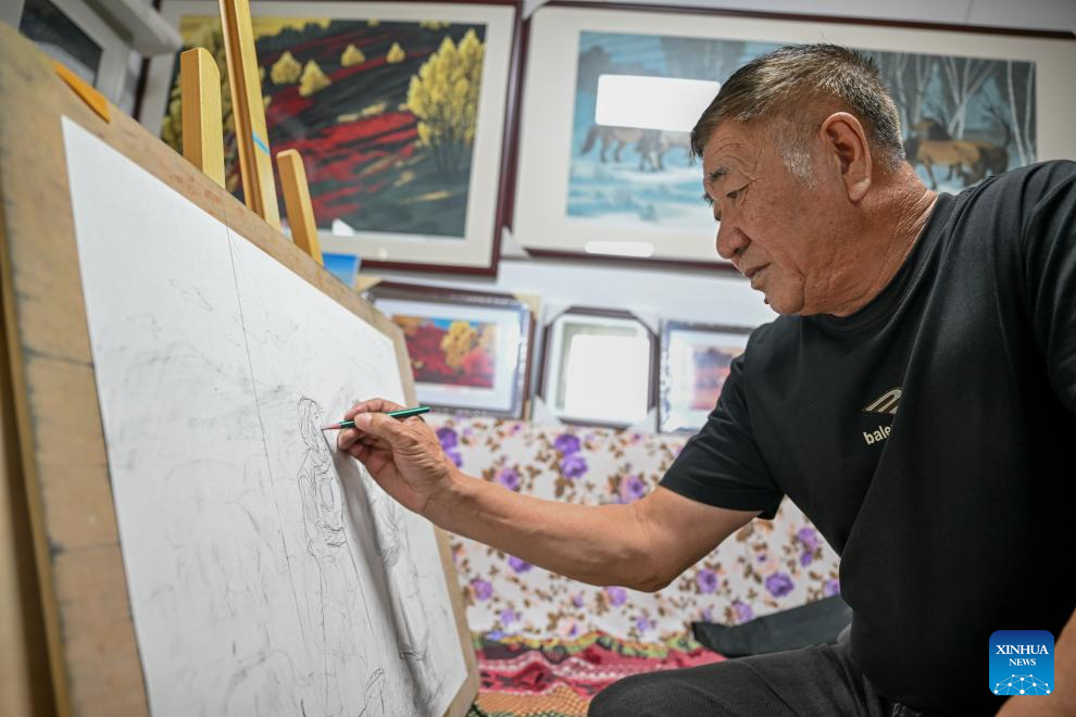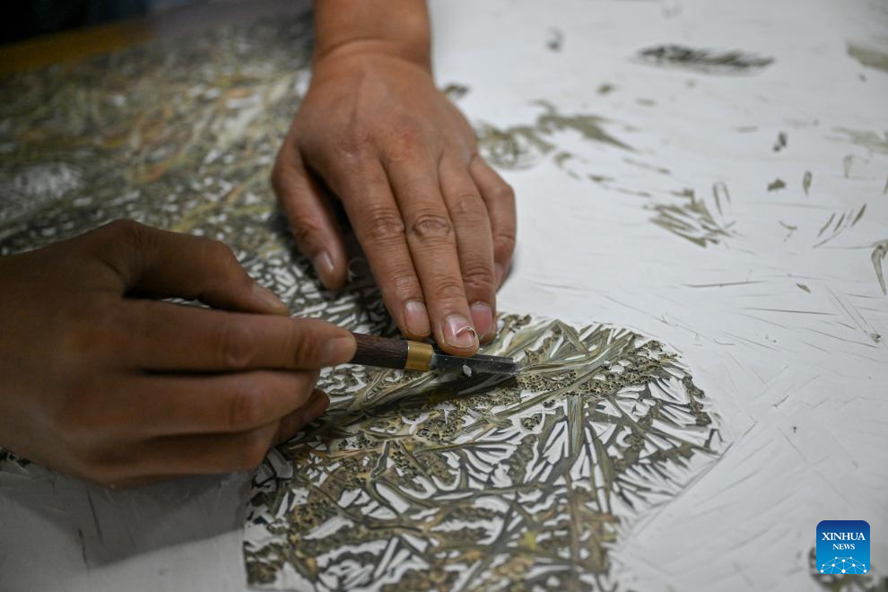 Painter Qi Tongyue creates a Jarud woodblock painting at a woodblock painting institute in Jarud Banner, north China's Inner Mongolia Autonomous Region, Aug. 10, 2025. (Xinhua/Liu Wenhui)