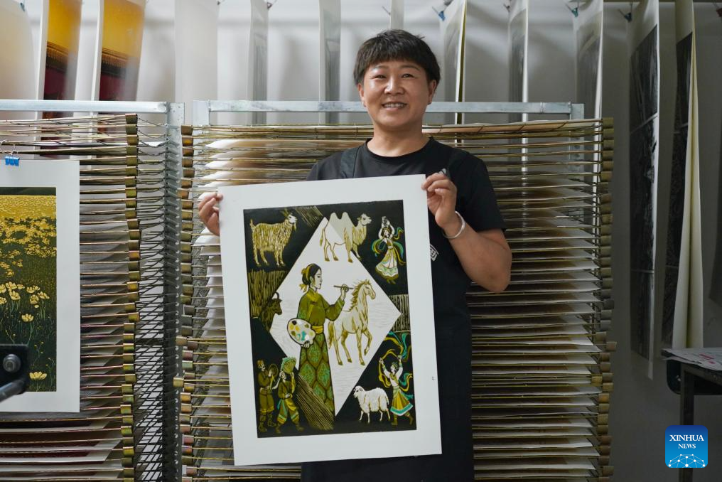 Painter Chen Qimeg shows one of her artworks at a woodblock painting institute in Jarud Banner, north China's Inner Mongolia Autonomous Region, Aug. 10, 2025. (Xinhua/Liu Wenhui)