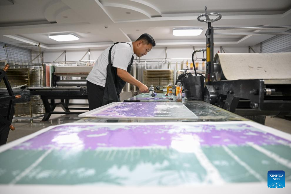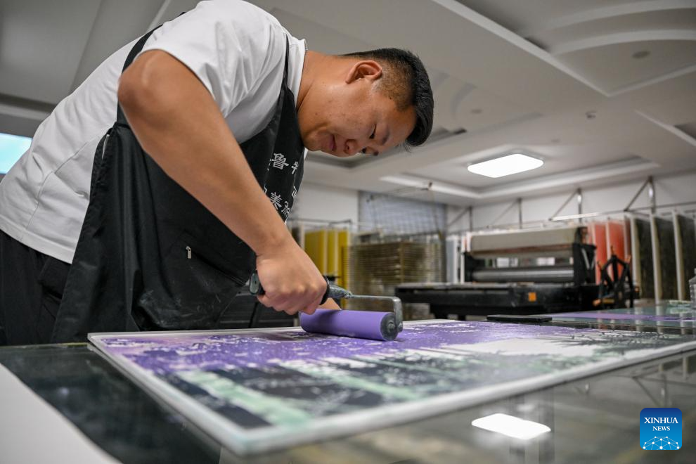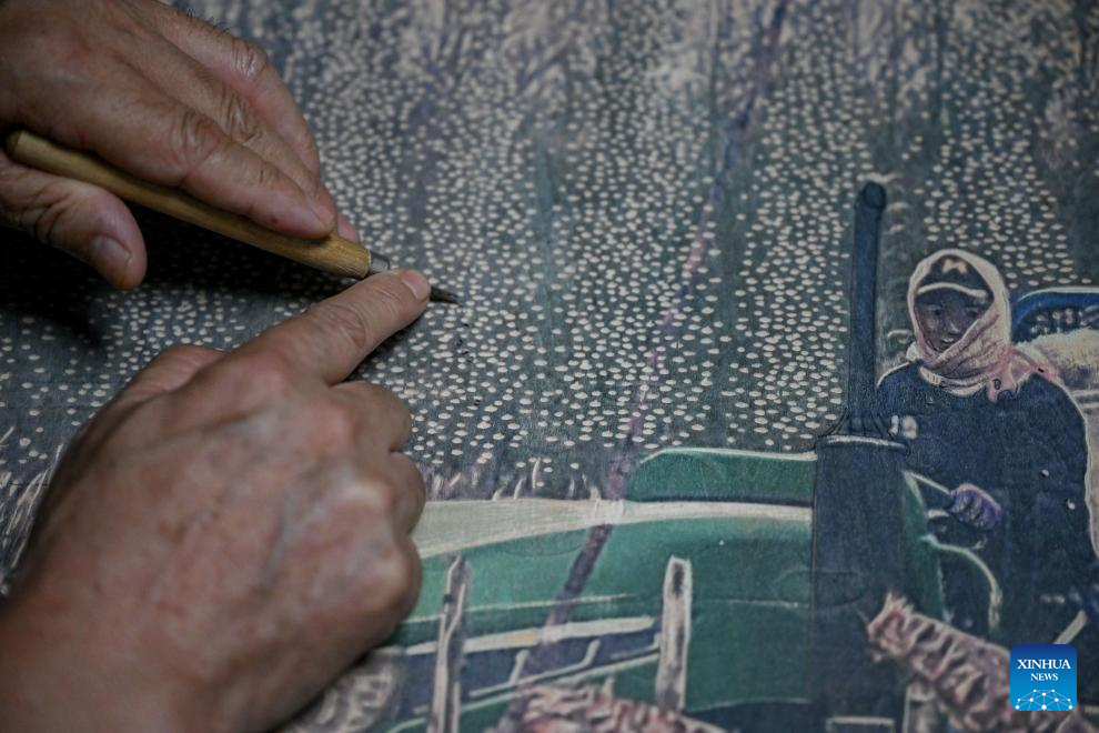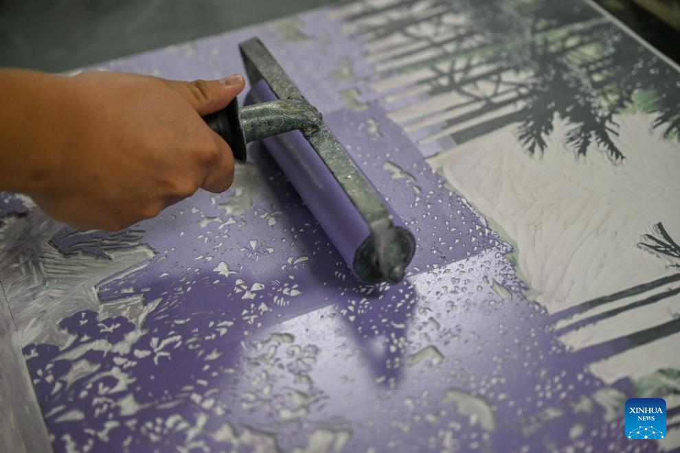Painter Shi Fangyu creates a Jarud woodblock painting at a woodblock painting institute in Jarud Banner, north China's Inner Mongolia Autonomous Region, Aug. 10, 2025. (Xinhua/Lian Zhen)