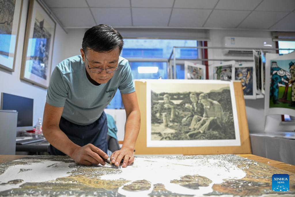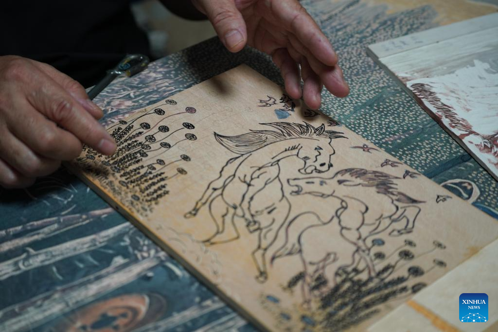 Painter Zhao Zhi creates a Jarud woodblock painting at a woodblock painting institute in Jarud Banner, north China's Inner Mongolia Autonomous Region, Aug. 10, 2025. (Xinhua/Lian Zhen)