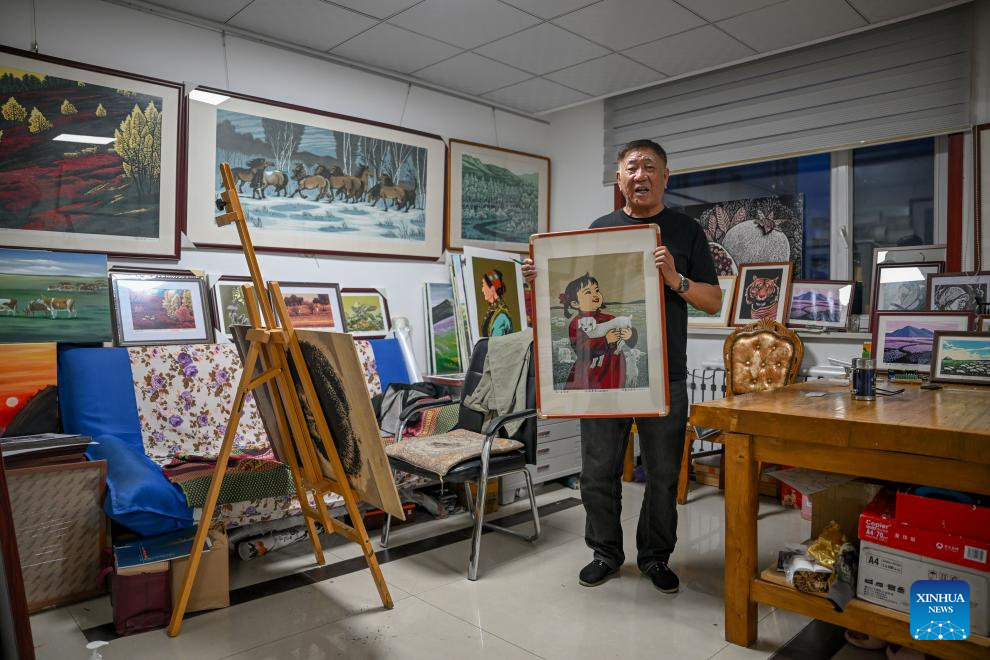 Zhaun Namur, a representative inheritor of Jarud woodblock painting art, shows one of his artworks at a woodblock painting institute in Jarud Banner, north China's Inner Mongolia Autonomous Region, Aug. 10, 2025. The creation of a Jarud woodblock painting work, which originated in Jarud Banner in the late 1950s, has to go through more than a dozen steps, finished with engraving knife, woodblock and ink.