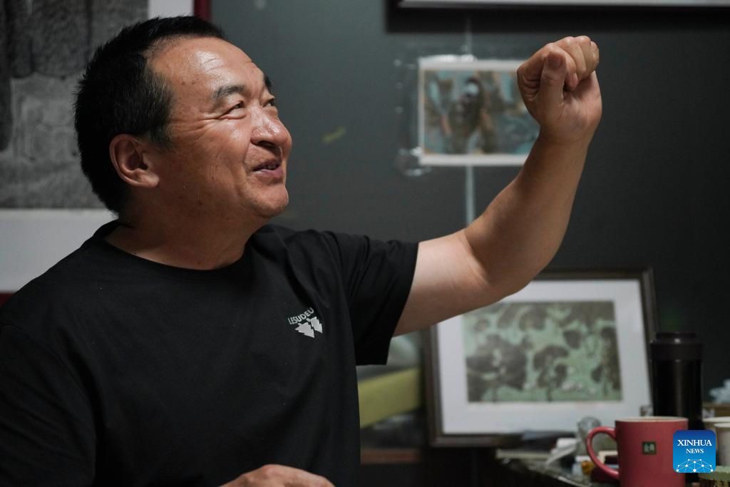Painter Qi Tongyue introduces his artworks at a woodblock painting institute in Jarud Banner, north China's Inner Mongolia Autonomous Region, Aug. 10, 2025. (Xinhua/Liu Wenhui)