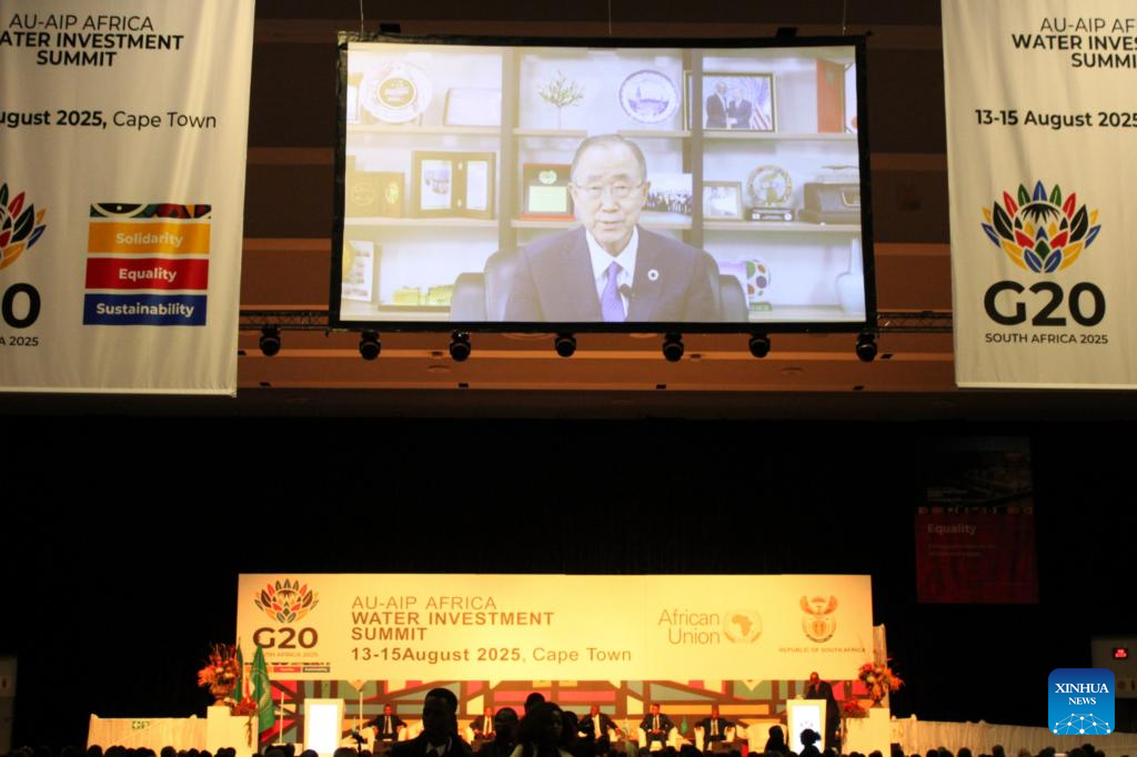Ban Ki-moon (on the screen), former secretary-general of the United Nations, delivers a video speech at the Africa Water Investment Summit in Cape Town, South Africa, on Aug. 13, 2025. (Photo by Shakirah Thebus/Xinhua)