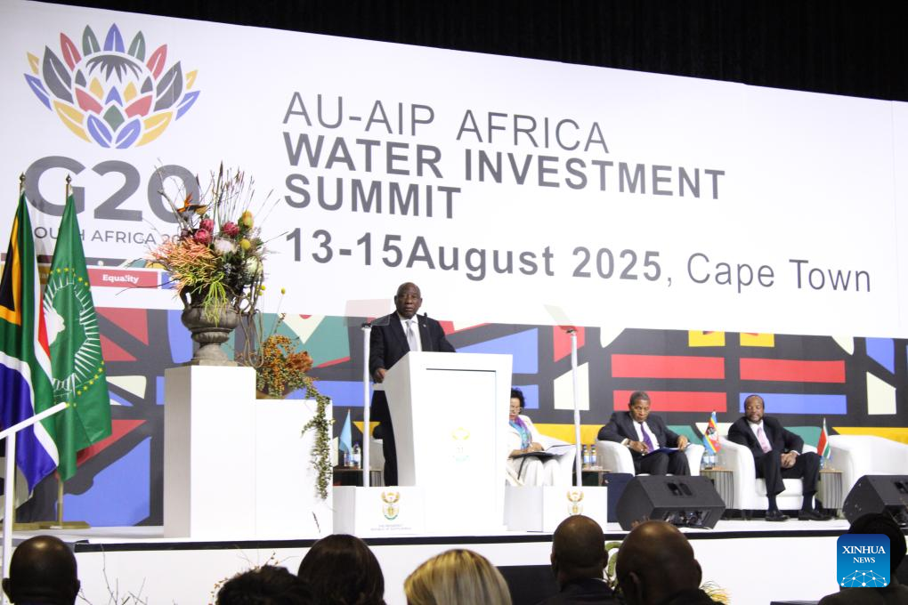 South African President Cyril Ramaphosa (at the podium) delivers his opening address at the Africa Water Investment Summit in Cape Town, South Africa, on Aug. 13, 2025. (Photo by Shakirah Thebus/Xinhua)
