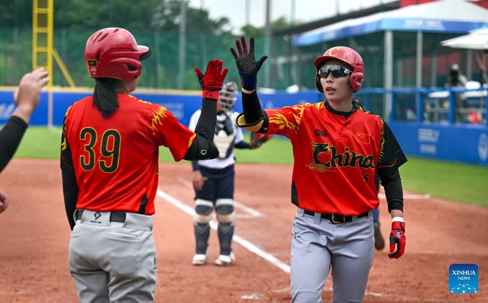 Ren Min (R) of China celebrates with teammate Xie Jiaxin during the Softball Women's Preliminary Round Group A Game between Chinese Taipei and China at The World Games 2025 in Chengdu, southwest China's Sichuan Province, Aug. 14, 2025. (Xinhua/Feng Kaihua)