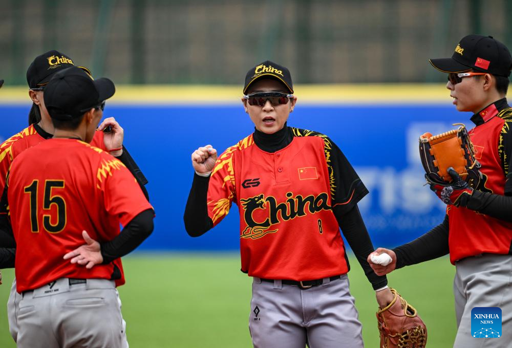 Players of China cheer during the Softball Women's Preliminary Round Group A Game between Chinese Taipei and China at The World Games 2025 in Chengdu, southwest China's Sichuan Province, Aug. 14, 2025. (Xinhua/Feng Kaihua)