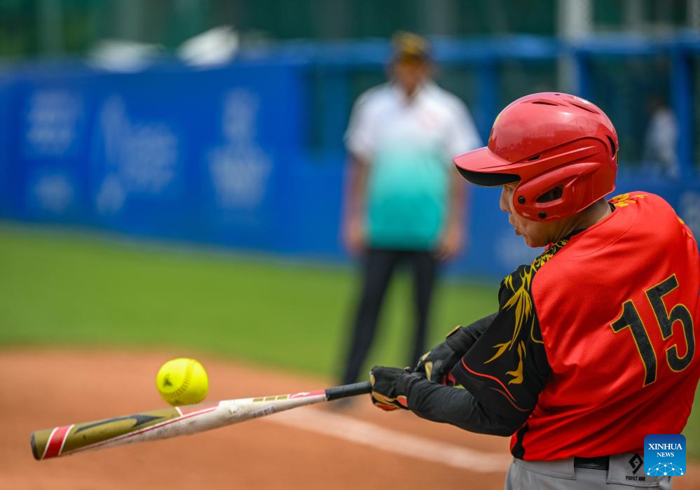 Wang Bei (2nd L) of China competes during the Softball Women's Preliminary Round Group A Game between Chinese Taipei and China at The World Games 2025 in Chengdu, southwest China's Sichuan Province, Aug. 14, 2025. (Xinhua/Feng Kaihua)