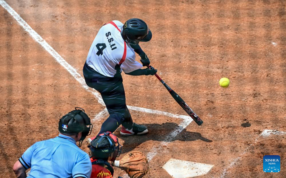 Li Szu-Shih (top) of Chinese Taipei competes during the Softball Women's Preliminary Round Group A Game between Chinese Taipei and China at The World Games 2025 in Chengdu, southwest China's Sichuan Province, Aug. 14, 2025. (Xinhua/Feng Kaihua)