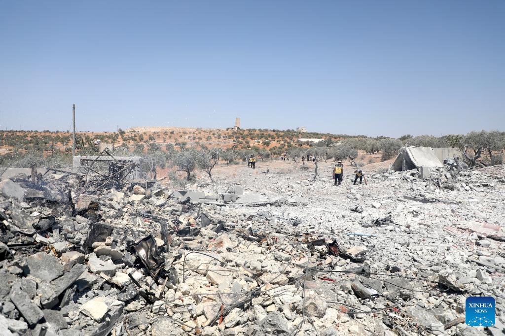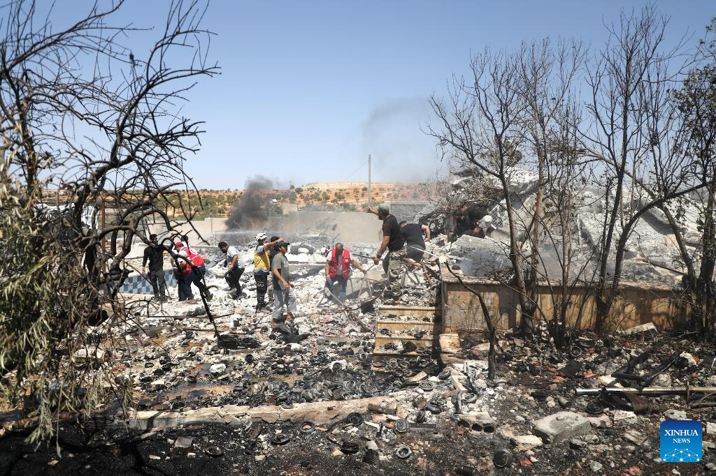 Rescue workers and residents search through the rubble following an explosion in Idlib, Syria, Aug. 14, 2025. (Str/Xinhua)