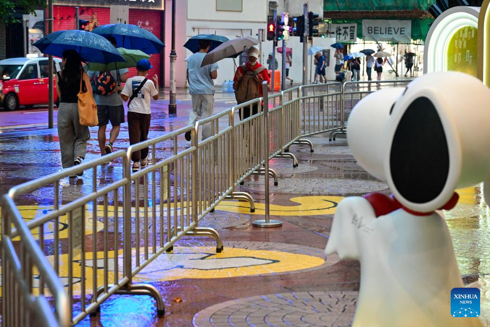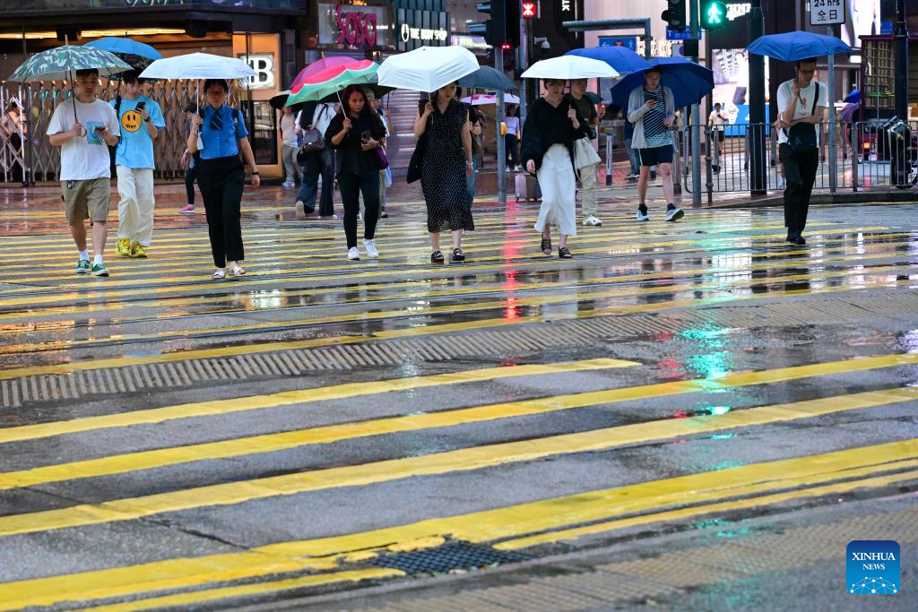 People holding umbrellas walk on a street in Hong Kong, south China, Aug. 14, 2025. The Hong Kong Observatory on Thursday morning issued the black rainstorm warning signal, the highest level in its three-tier heavy rain alert system. (Xinhua/Zhu Wei)