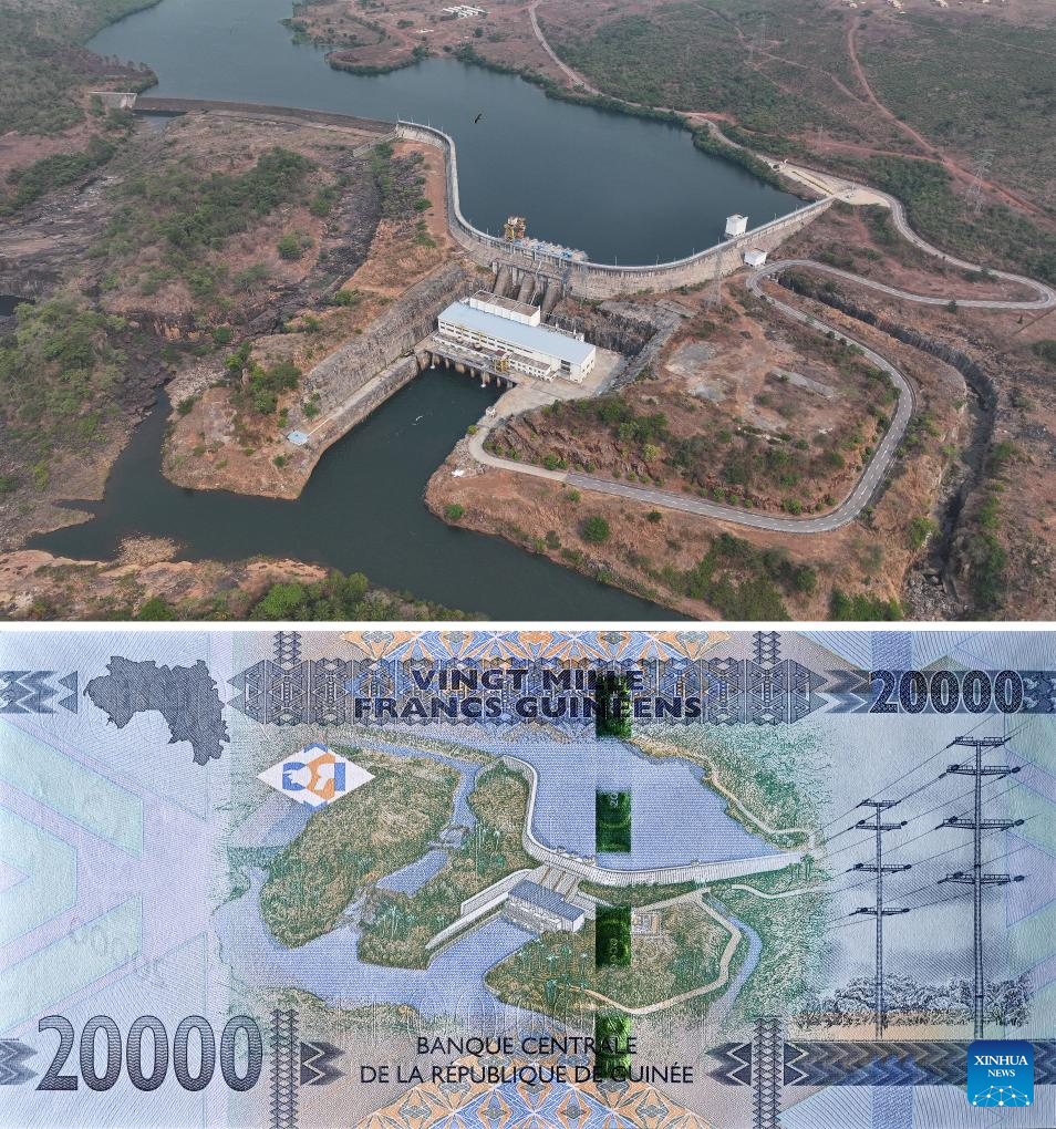 The combo photo shows an aerial view of the Kaleta Hydropower Station in Dubreka, Guinea, on April 24, 2025 (Top) and a 20,000-Guinean franc banknote bearing the image of Kaleta Hydropower Station, on May 1, 2025 (Bottom). (Xinhua/Han Xu)