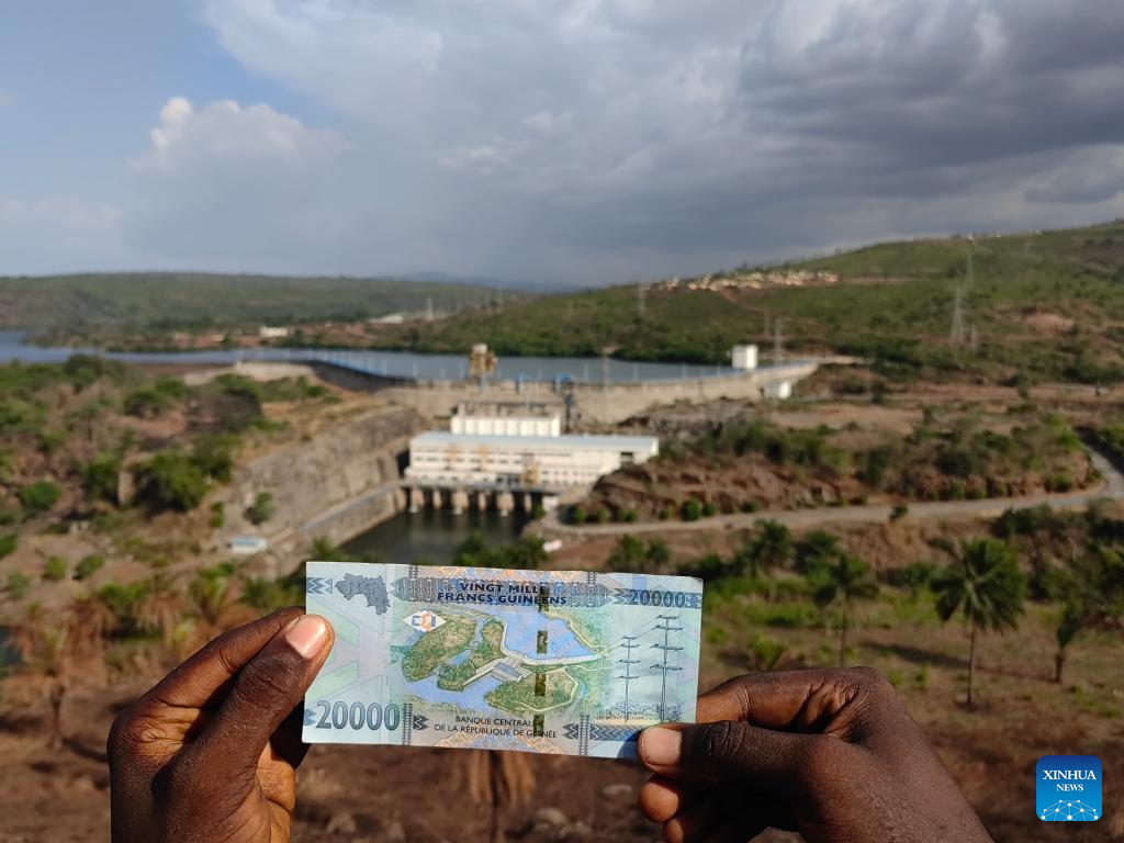Photo taken on May 3, 2025 shows a 20,000-Guinean franc banknote bearing the image of the Kaleta Hydropower Station with the Kaleta Hydropower Station in the background in Dubreka, Guinea. (CWE/Handout via Xinhua)