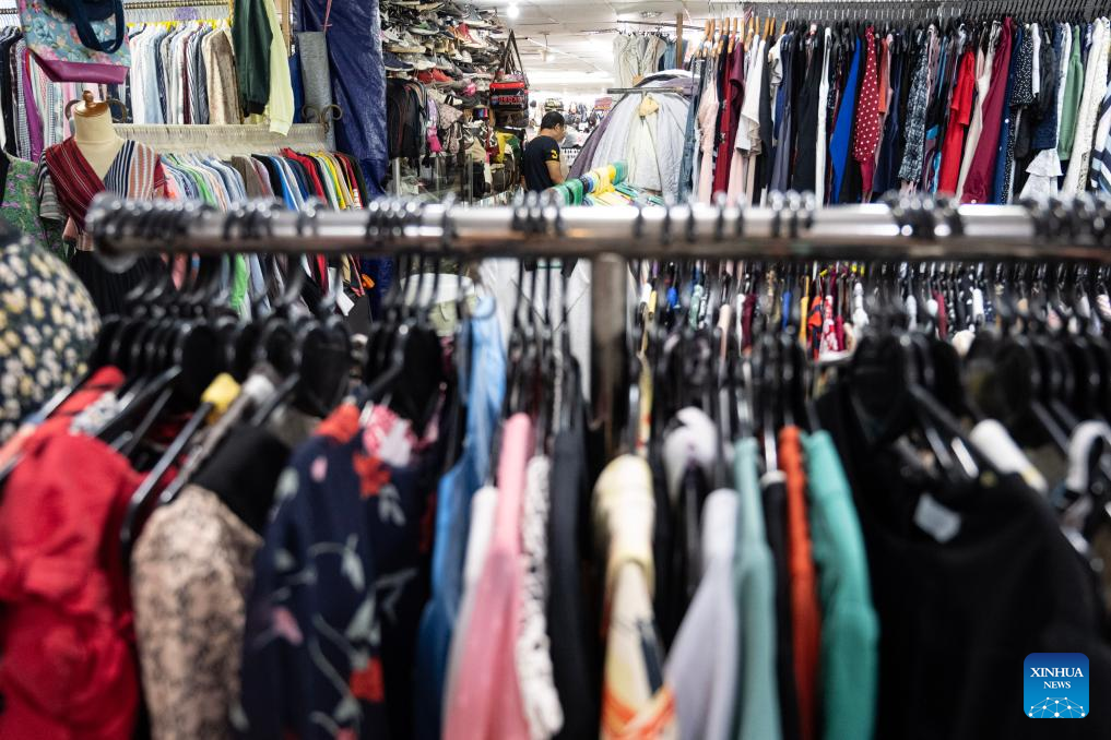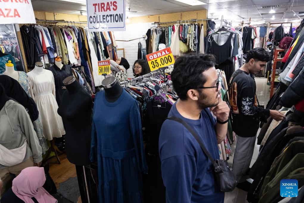 People select secondhand clothes at a shop in Pasar Baru, Jakarta, Aug. 13, 2025. (Xinhua/Veri Sanovri)