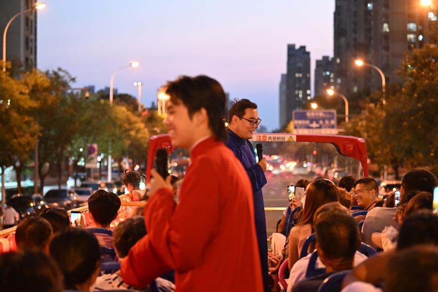 A "crosstalk bus" stops by the side of Haihe River in Tianjin, north China, Aug. 13, 2025. (Xinhua/Li Ran)Tourists line up to get on a "crosstalk bus" in Tianjin, north China, Aug. 13, 2025. (Xinhua/Li Ran)Crosstalk artists perform on a "crosstalk bus" in Tianjin, north China, Aug. 13, 2025. (Xinhua/Li Ran)An artist performs kuaiban, a traditional Chinese performance art that combines rhythmic clapping with storytelling, on a "crosstalk bus" in Tianjin, north China, Aug. 13, 2025. (Xinhua/Li Ran)■