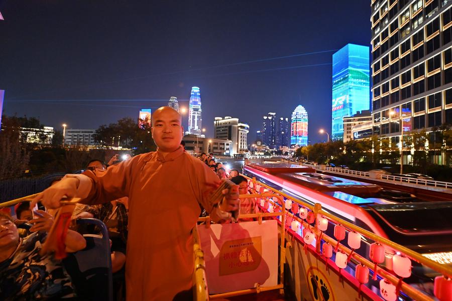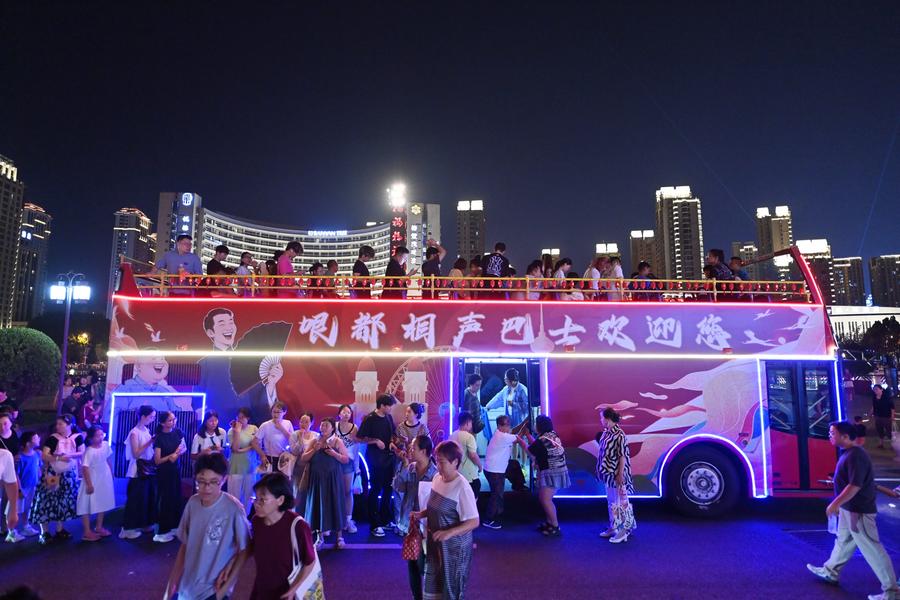 TIANJIN, Aug. 14 (Xinhua) -- Tianjin in north China has inaugurated a special "crosstalk bus," regular night bus service with professional crosstalk artists performing onboard throughout the 50-minute journey. The launch of this bus service is part of the ongoing Tianjin Crosstalk Festival that opened on Aug. 2.