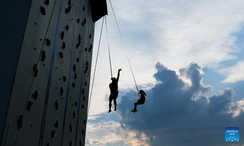 Deng Lijuan (L) of China celebrates after winning the Sport Climbing Women's Speed Single Finals Gold Medal Final against Qin Yumei of China at The World Games 2025 in Chengdu, southwest China's Sichuan Province, Aug. 14, 2025. (Xinhua/Tenzin Nyida)