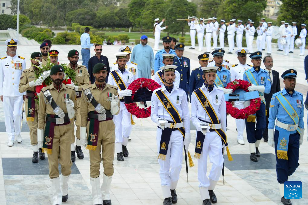 Pakistani soldiers attend a ceremony at the mausoleum of Pakistan's founder Muhammad Ali Jinnah to mark the country's Independence Day in southern Pakistani port city of Karachi on Aug. 14, 2025. (Str/Xinhua)