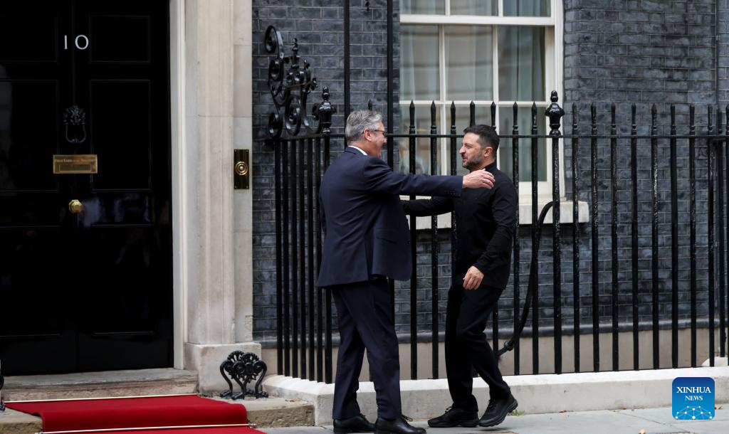 British Prime Minister Keir Starmer (L) welcomes Ukrainian President Volodymyr Zelensky at 10 Downing Street in London, Britain, Aug. 14, 2025. (Xinhua/Li Ying)