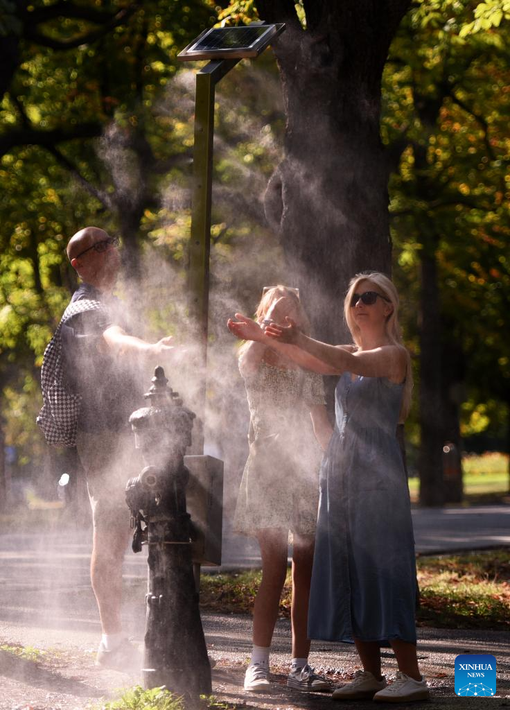 People cool off with a mist cooling system amid a heatwave in Vienna, Austria, Aug. 14, 2025.