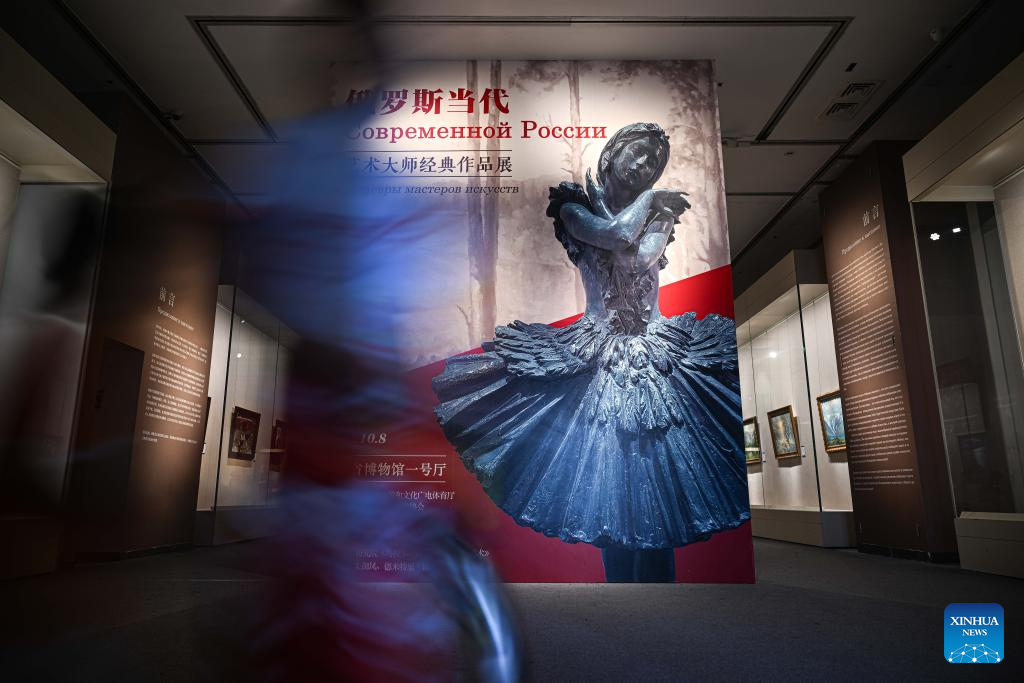 This photo taken on Aug. 13, 2025 shows the scene of an exhibition featuring classic works of 10 contemporary Russian art masters at Hainan Museum in Haikou, south China's Hainan Province. (Xinhua/Pu Xiaoxu)