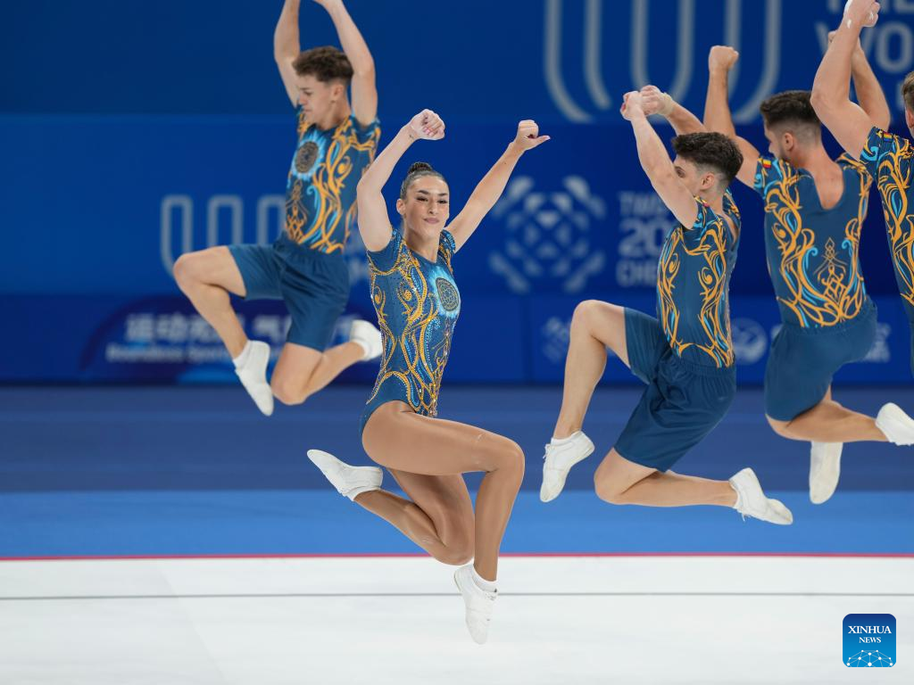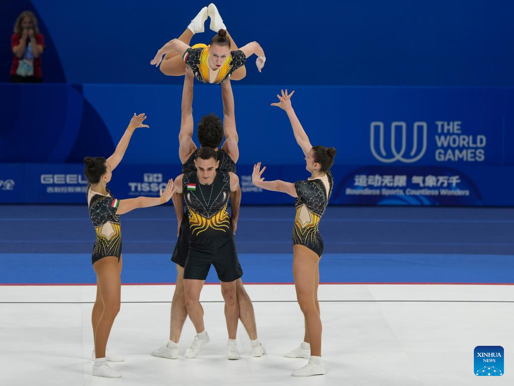 CHENGDU, Aug. 15 (Xinhua) -- China claimed the aerobic gymnastics group gold at the Chengdu World Games here on Friday, with Italy taking silver and Romania bronze at the Dong'an Lake Sports Park Multi-Function Gymnasium.