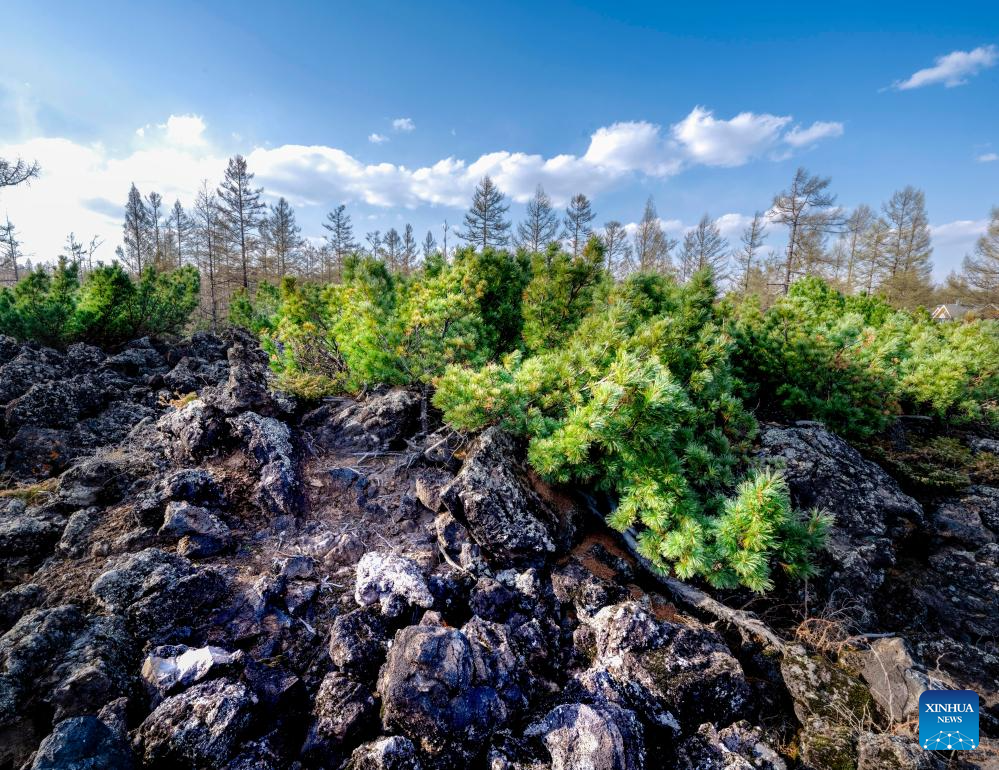 This photo taken on May 19, 2025 shows the lava landform and forest at the Arxan national forest park in Arxan, north China's Inner Mongolia Autonomous Region. Arxan, a city with less than 40,000 residents and a vegetation coverage of over 95 percent, sits at the southwestern foot of the Dahinggan Mountains, also the intersection of four major grasslands in northern China. It is now an increasingly popular tourist destination. (Xinhua/Ma Jinrui)