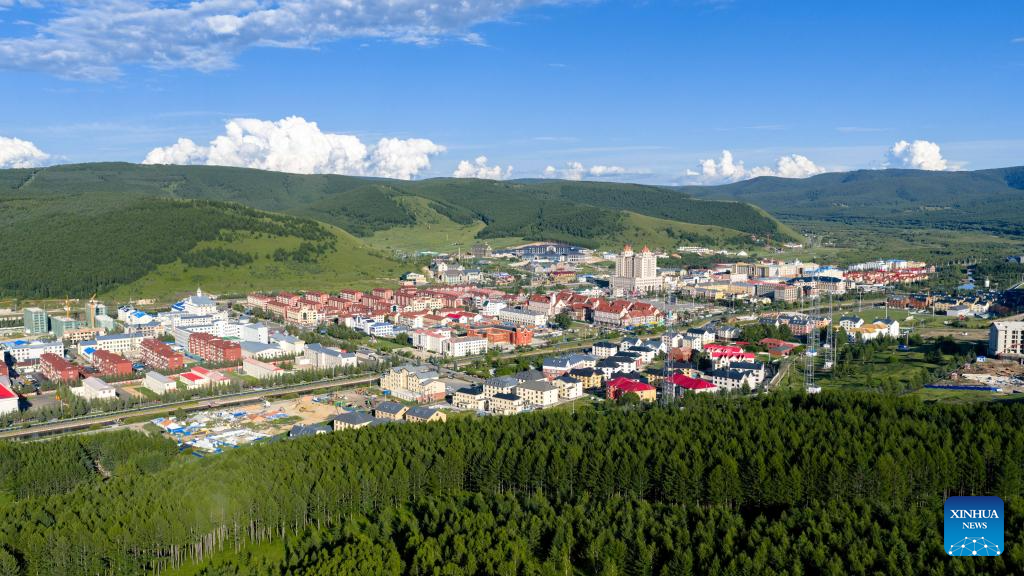 An aerial drone photo taken on July 27, 2025 shows the city view in Arxan, north China's Inner Mongolia Autonomous Region. Arxan, a city with less than 40,000 residents and a vegetation coverage of over 95 percent, sits at the southwestern foot of the Dahinggan Mountains, also the intersection of four major grasslands in northern China. It is now an increasingly popular tourist destination. (Xinhua/Ma Jinrui)