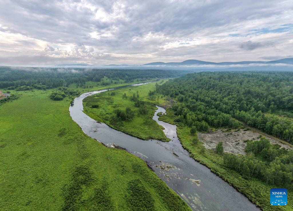 An aerial drone photo taken on July 28, 2025 shows the Halha River in Arxan, north China's Inner Mongolia Autonomous Region. Arxan, a city with less than 40,000 residents and a vegetation coverage of over 95 percent, sits at the southwestern foot of the Dahinggan Mountains, also the intersection of four major grasslands in northern China. It is now an increasingly popular tourist destination. (Xinhua/Ma Jinrui)