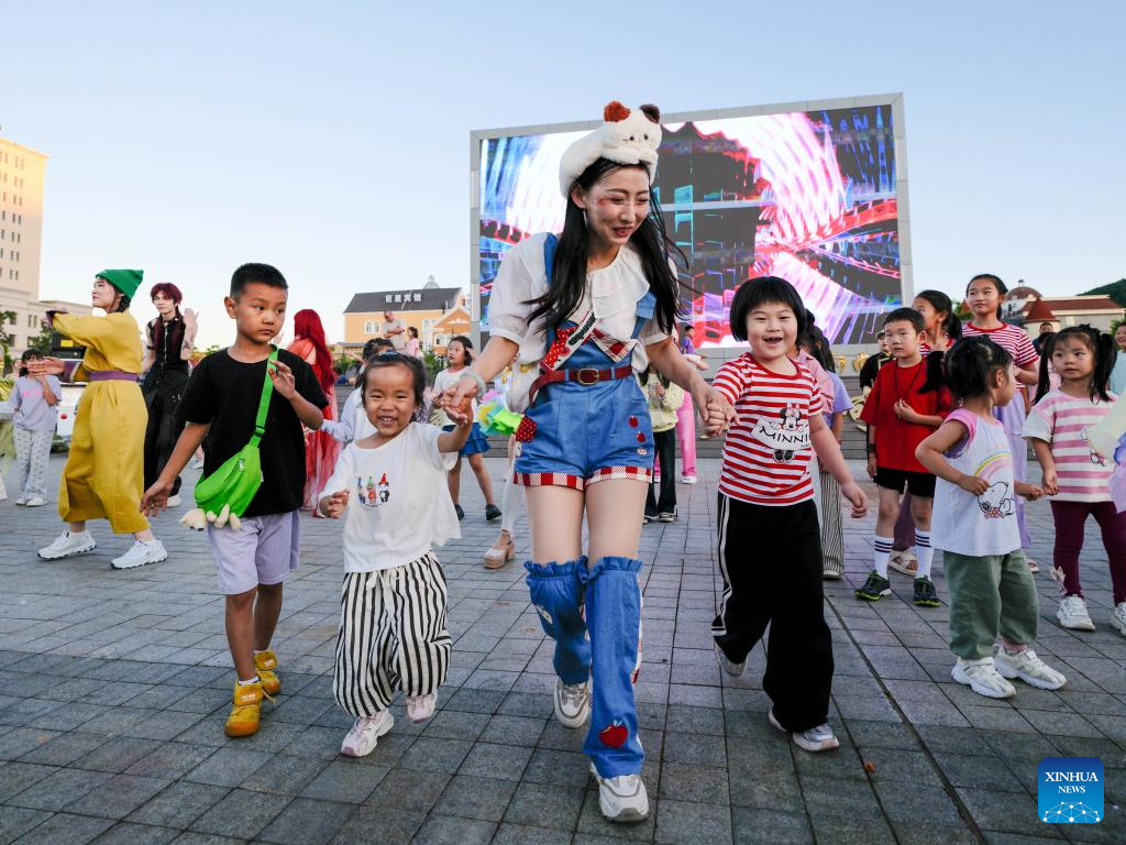 Children interact with a performer during a float parade on a square in Arxan, north China's Inner Mongolia Autonomous Region, July 27, 2025. Arxan, a city with less than 40,000 residents and a vegetation coverage of over 95 percent, sits at the southwestern foot of the Dahinggan Mountains, also the intersection of four major grasslands in northern China. It is now an increasingly popular tourist destination. (Xinhua/Ma Jinrui)