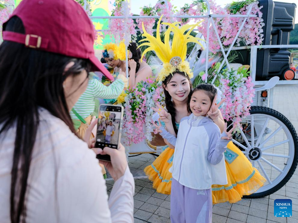 A girl poses for photos with a performer during a float parade on a square in Arxan, north China's Inner Mongolia Autonomous Region, July 27, 2025. Arxan, a city with less than 40,000 residents and a vegetation coverage of over 95 percent, sits at the southwestern foot of the Dahinggan Mountains, also the intersection of four major grasslands in northern China. It is now an increasingly popular tourist destination. (Xinhua/Ma Jinrui)