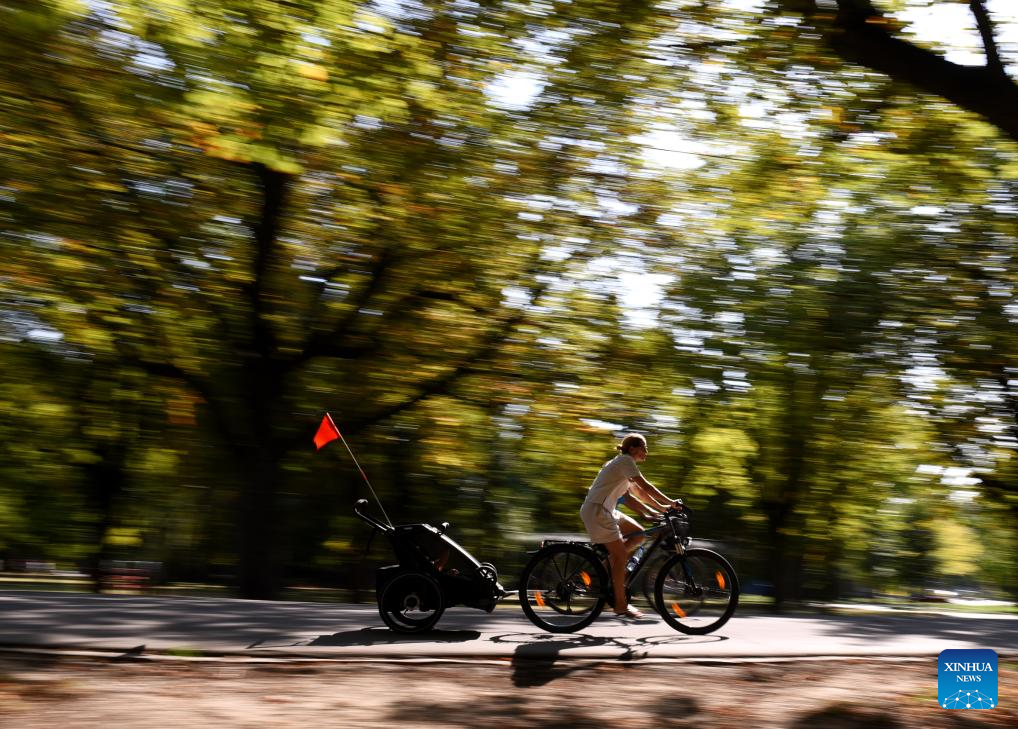 People ride along Prater Hauptallee amid a heatwave in Vienna, Austria, on Aug. 14, 2025. (Xinhua/He Canling)