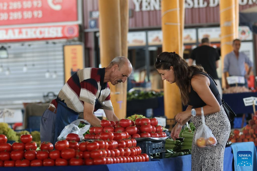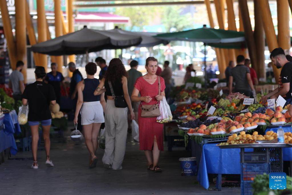 ANKARA, Aug. 15 (Xinhua) -- In the bustling open-air market of capital city Ankara's 100th Yil district, shoppers weave between stalls under a patchwork of canvas awnings, their eyes darting from price tags to their shopping lists.