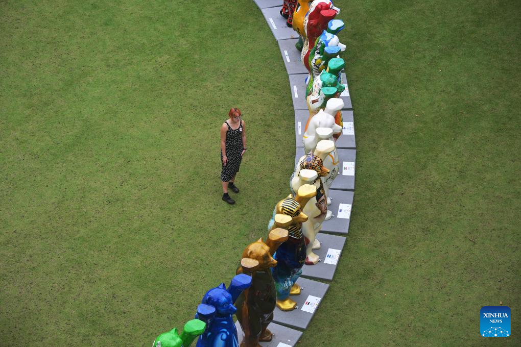 A woman views the life-size bears of "United Buddy Bears" exhibition at the Singapore's Gardens by the Bay on Aug. 14, 2025. (Photo by Then Chih Wey/Xinhua)