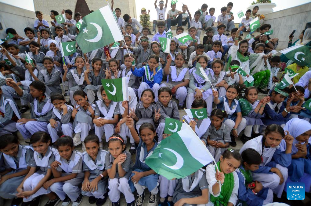 Pakistani students wave national flags during a ceremony at the mausoleum of Pakistan's founder Muhammad Ali Jinnah to mark the country's Independence Day in southern Pakistani port city of Karachi on Aug. 14, 2025. (Str/Xinhua)