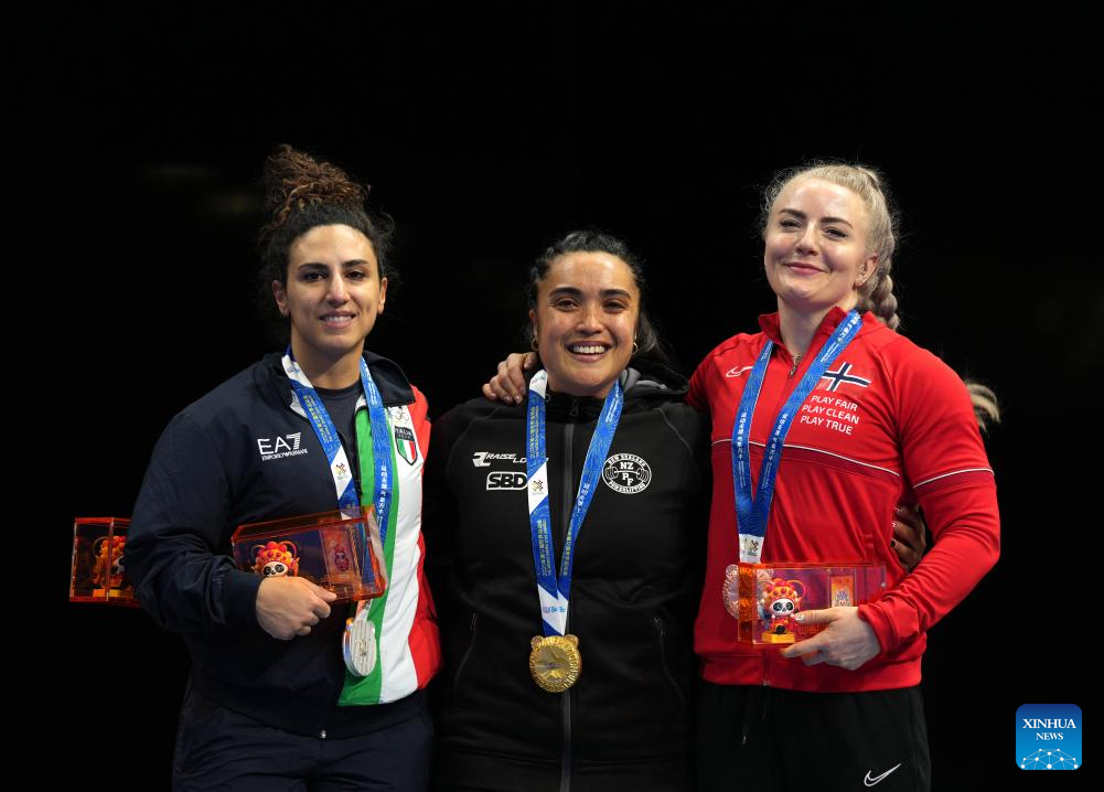 Gold medalist Karlina Tongotea (C) of New Zealand, silver medalist Carola Garra (L) of Italy and bronze medalist Marte Kjenner of Norway pose during the victory ceremony for the Women's Heavyweight of Powerlifting event at The World Games 2025 in Chengdu, southwest China's Sichuan Province, Aug. 15, 2025. (Xinhua/Xu Suhui)