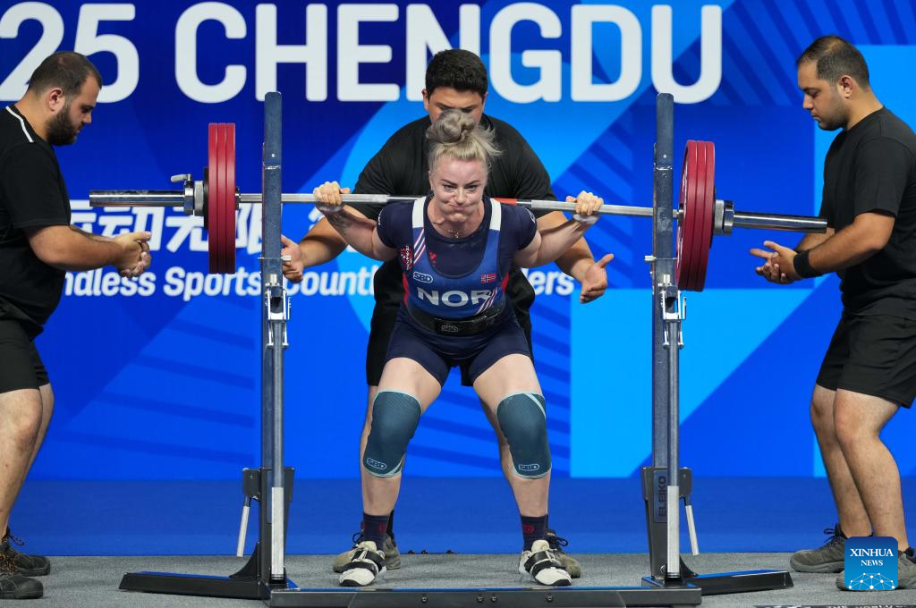 Marte Kjenner of Norway competes during the Women's Heavyweight Final of Powerlifting event at The World Games 2025 in Chengdu, southwest China's Sichuan Province, Aug. 15, 2025. (Xinhua/Xu Suhui)