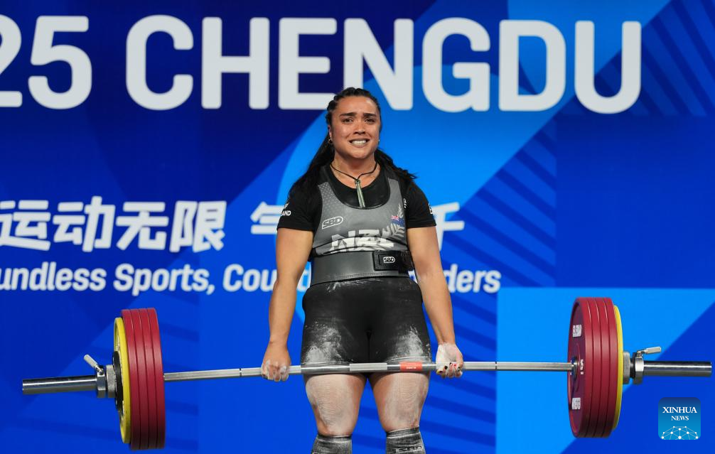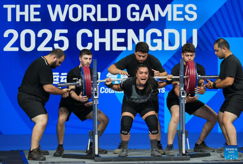 Karlina Tongotea of New Zealand competes during the Women's Heavyweight Final of Powerlifting event at The World Games 2025 in Chengdu, southwest China's Sichuan Province, Aug. 15, 2025. (Xinhua/Xu Suhui)
