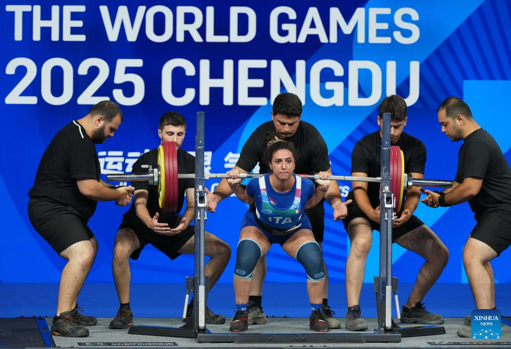 Carola Garra of Italy competes during the Women's Heavyweight Final of Powerlifting event at The World Games 2025 in Chengdu, southwest China's Sichuan Province, Aug. 15, 2025. (Xinhua/Xu Suhui)