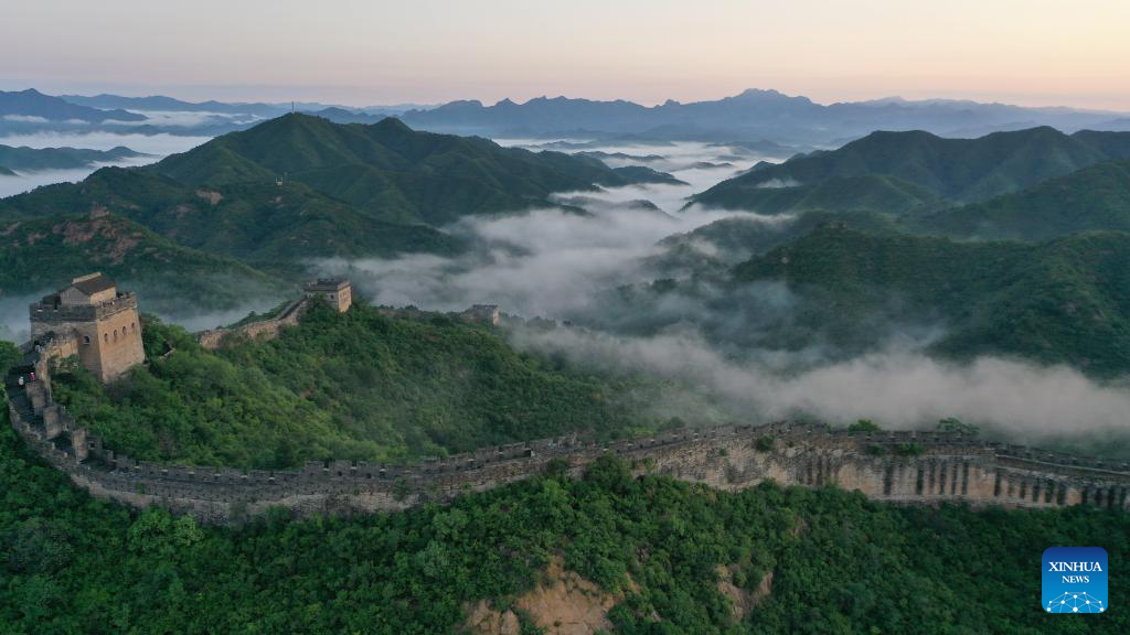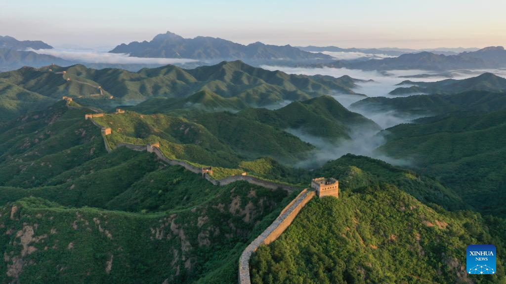 An aerial drone photo taken on Aug. 14, 2025 shows a view of the Jinshanling section of the Great Wall in Luanping County of Chengde, north China's Hebei Province. (Photo by Zhou Wanping/Xinhua)