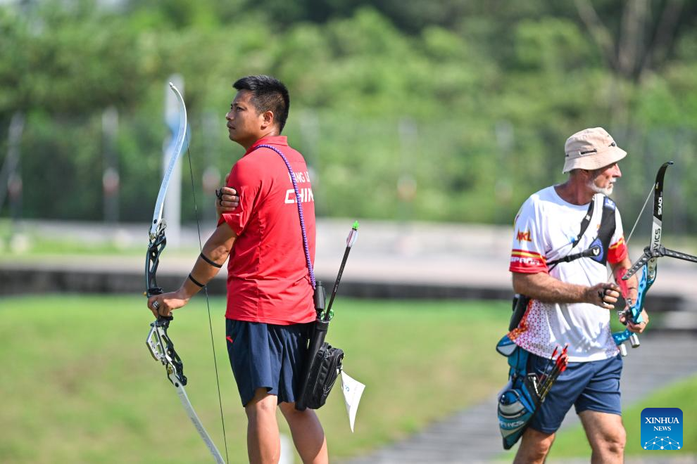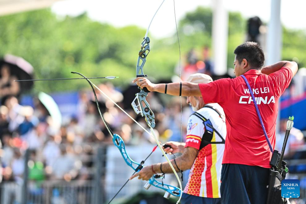 Wang Lei (L) of China and Cesar Vera of Spain compete during the Archery Men's Barebow Elimination Group B Match at The World Games 2025 in Chengdu, southwest China's Sichuan Province, Aug. 15, 2025. (Xinhua/Yang Wenbin)