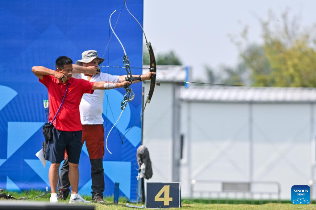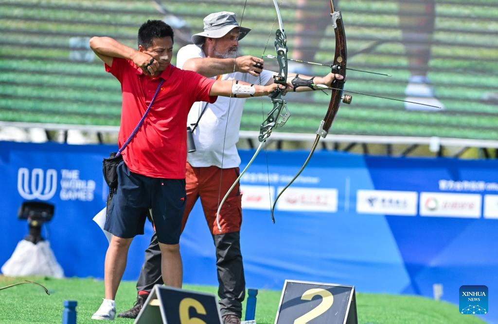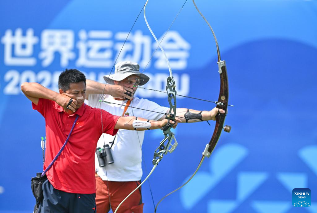 Wang Lei (L) of China and Jozsef Molnar of Hungary compete during the Archery Men's Barebow Elimination Group B Match at The World Games 2025 in Chengdu, southwest China's Sichuan Province, Aug. 15, 2025. (Xinhua/Yang Wenbin)